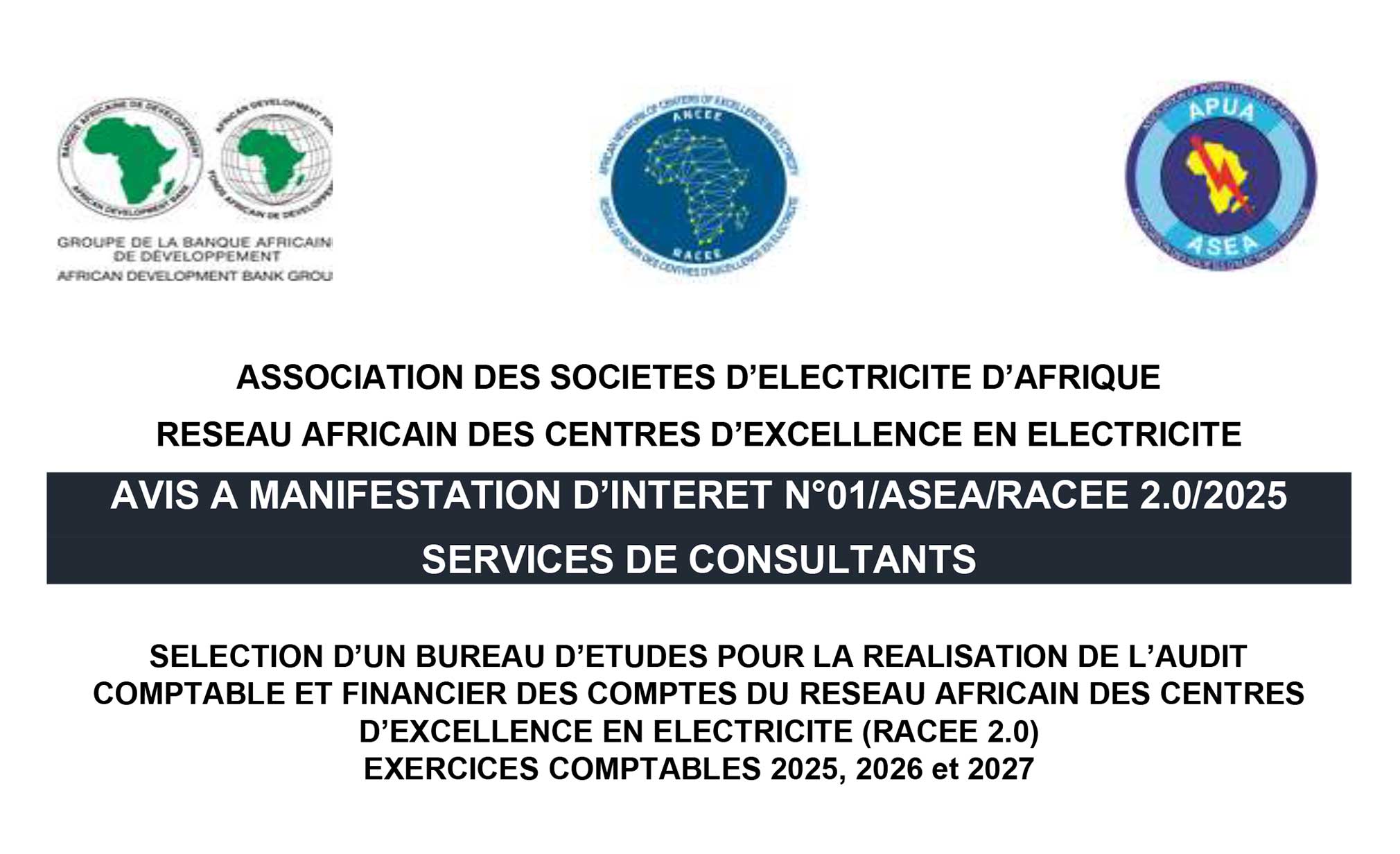 SELECTION D’UN BUREAU D’ETUDES POUR LA REALISATION DE L’AUDIT, COMPTABLE ET FINANCIER DES COMPTES DU RESEAU AFRICAIN DES CENTRES D’EXCELLENCE EN ELECTRICITE (RACEE 2.0), EXERCICES COMPTABLES 2025, 2026 et 2027