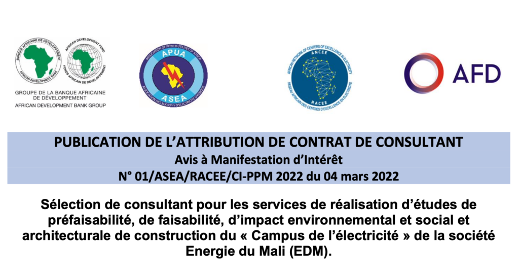 Synthèse de l’objet du contrat : Réalisation d’études de préfaisabilité, de faisabilité, d’impact environnemental et social et architecturale de construction du « Campus de l’électricité » de la société Energie du Mali…
