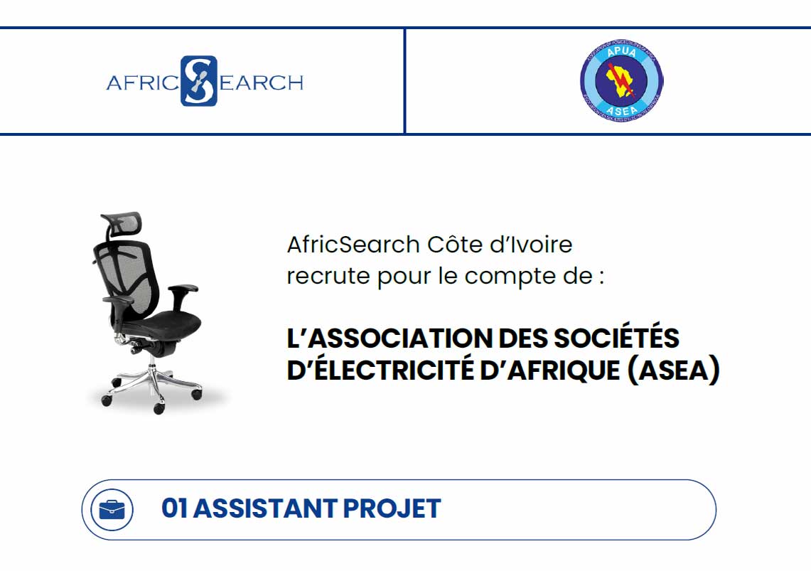 AfricSearch Côte d’Ivoire recrute pour le compte DE L’ASSOCIATION DES SOCIÉTÉS D’ÉLECTRICITÉ D’AFRIQUE (ASEA), UN ASSISTANT PROJET