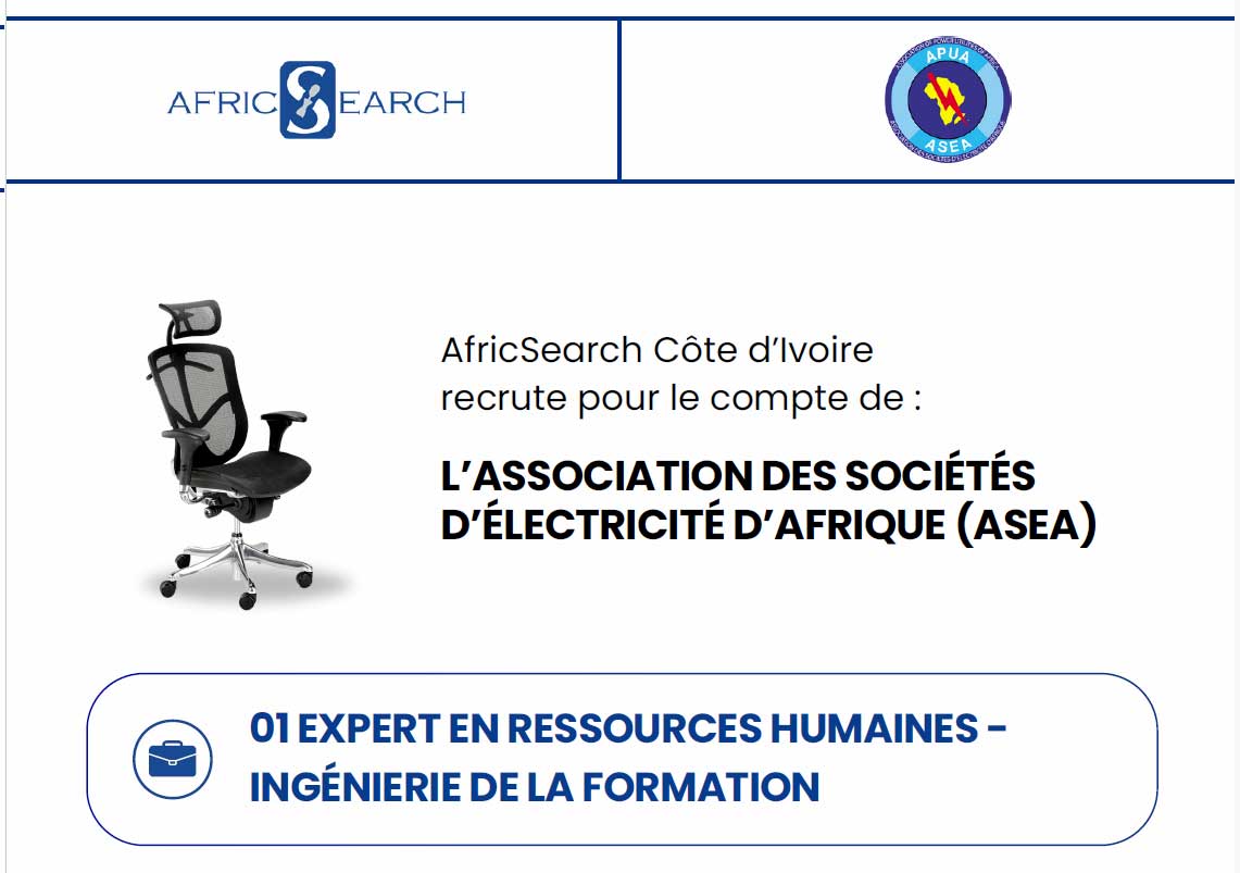 AfricSearch Côte d’Ivoire recrute pour le compte DE L’ASSOCIATION DES SOCIÉTÉS D’ÉLECTRICITÉ D’AFRIQUE (ASEA), UN EXPERT EN RESSOURCES HUMAINES – INGÉNIERIE DE LA FORMATION